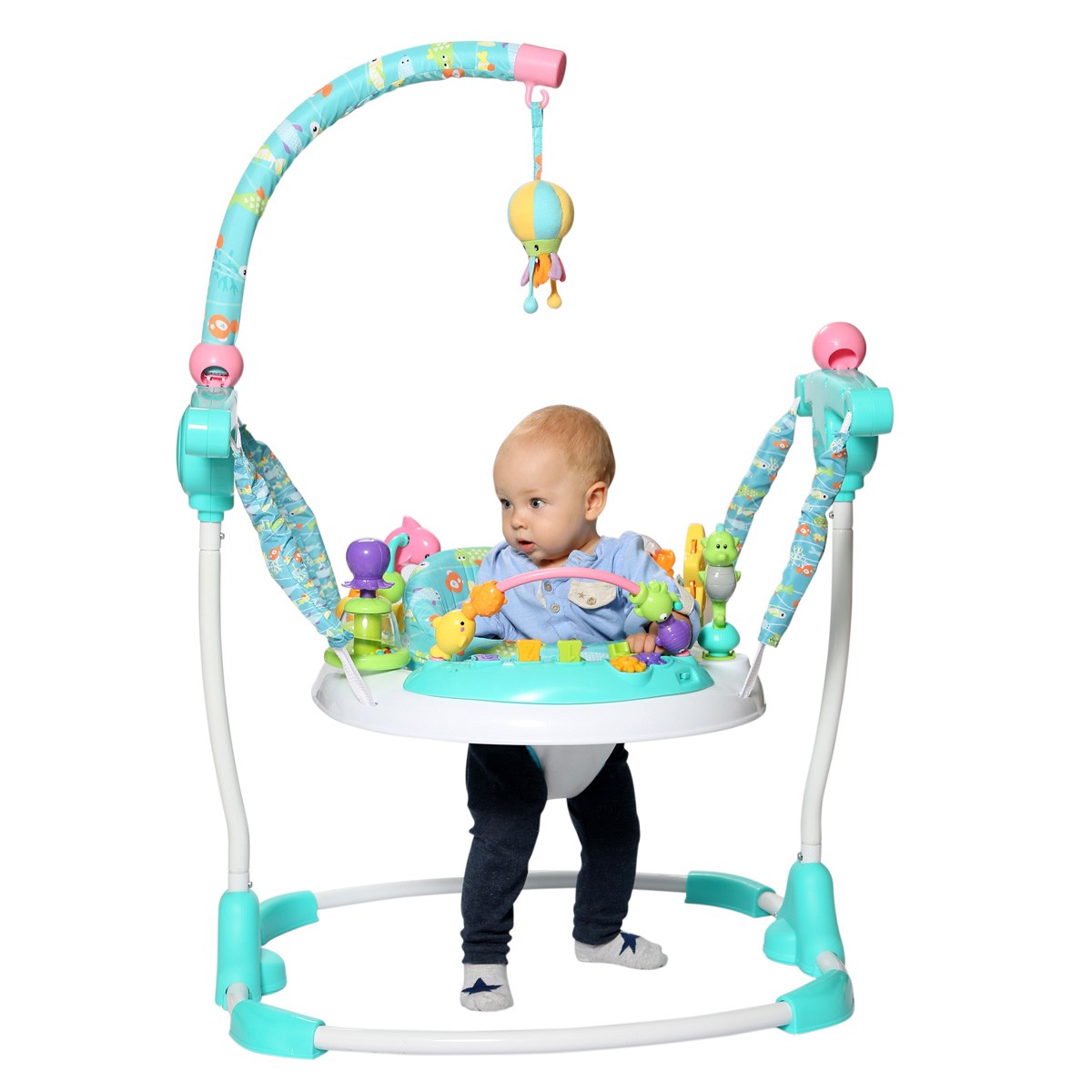 水世界跳床,海洋主题设计。海鱼印刷座布,小鱼拱形棒音乐盘,海马,海星,螃蟹,海豚,潜水艇及章鱼按压玩具,360度环绕,让宝宝有如徜徉海底世界。 座椅可360度旋转,宝宝可自由转动,尽情把玩各类玩具。 高强度吊带及弹簧固定上盘,让宝宝享受弹跳运动的乐趣,吊带长度可调节。 环形铁管底座,稳固安全。 章鱼毛绒玩具吊挂宝宝头顶,鼓励宝宝弹跳,抓握,锻炼宝宝运动能力。
