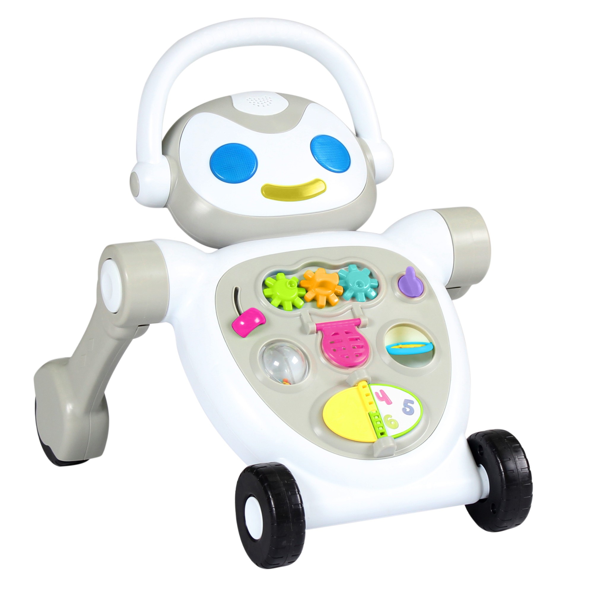 机器人外形设计,让可爱的小机器人陪伴宝宝一块成长。 宝宝能坐立的时候,可以坐着跟机器人玩耍;宝宝能站立的时候,可握住机器人的把手,推动机器人学步前进。 丰富的娱乐功能,按动机器人的嘴巴,机器人会讲话,按动眼睛,机器人会唱歌。 培养宝宝的动手能力,拨动齿轮,机器人身体里发出齿轮旋转声,拨动书页,机器人会唱字母歌,数字歌。 机器人的腿可折叠,方便携带与收纳。 礼盒包装,把宝宝的第一台机器人带回家送给宝宝吧。